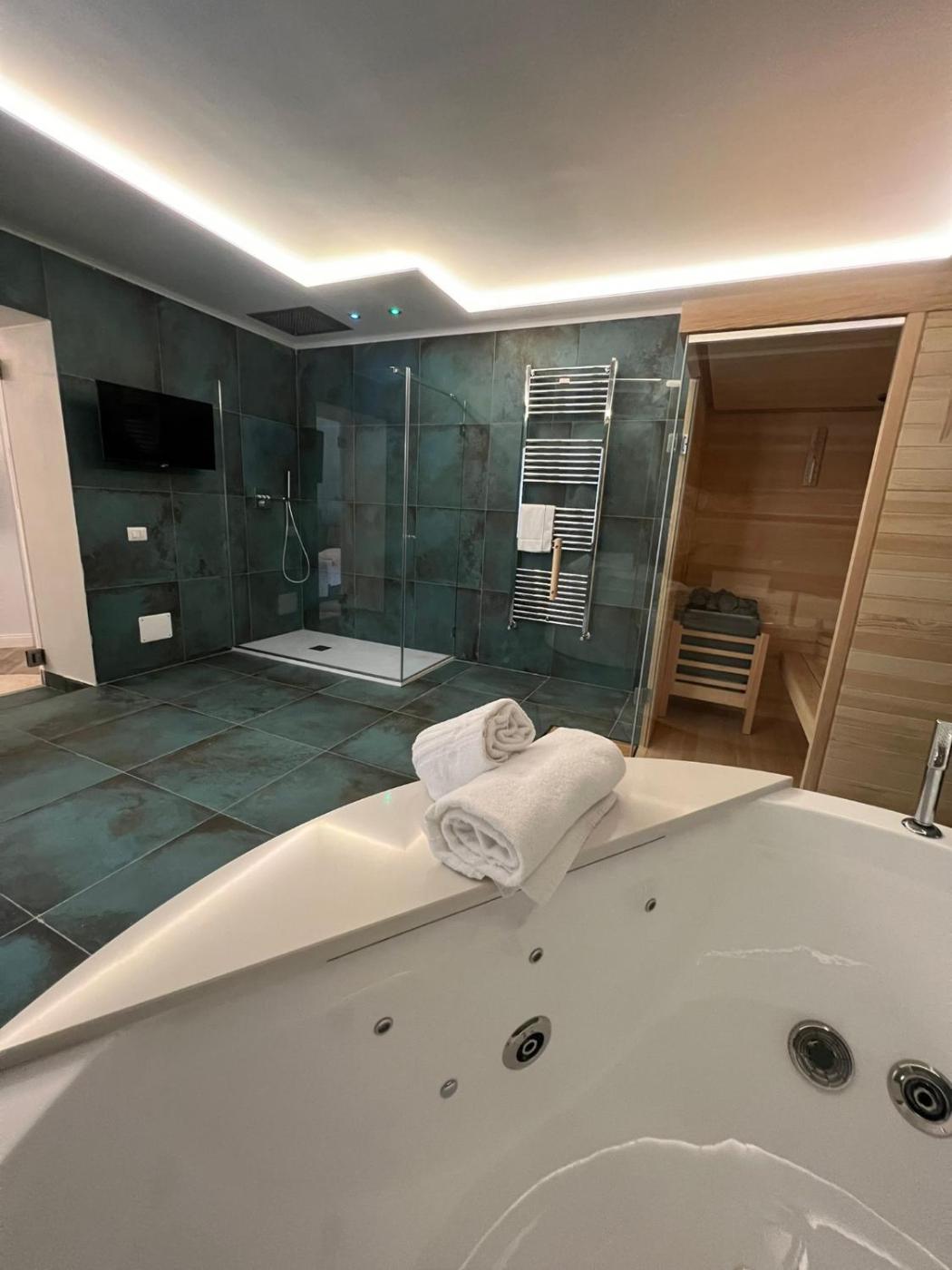 Suite con Spa Privata. Camera matrimoniale climatizzata con vasca idromassaggio e sauna. La tariffa della sistemazione include l’uso privato ed esclusivo di a una vasca da bagno con idromassaggio, una doccia con cromoterapia e una sauna.