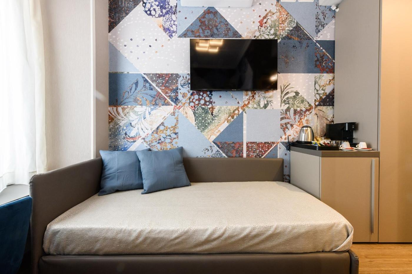 Camera Singola. Camera singola dotata di bagno privato con doccia,di cortesia, bidet e asciugacapelli. La camera singola è climatizzata e include pareti insonorizzate, TV a schermo piatto e cioccolato in omaggio. Lâalloggio dispone di 1 letto. ;